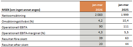 Market uncertainty has increased as a result of the unrest in the Middle East, where a scenario involving higher inflation and base rates could reduce demand and drive up costs. At the same time, we saw gradual improvements across all business units toward the end of the quarter, which gives us cause for cautious optimism. In any case, Inwido is well-equipped thanks to market-leading positions, our clearly decentralized governance model, and strong financial position. The long-term ambition remains unchanged and we are executing on our strategic plan.